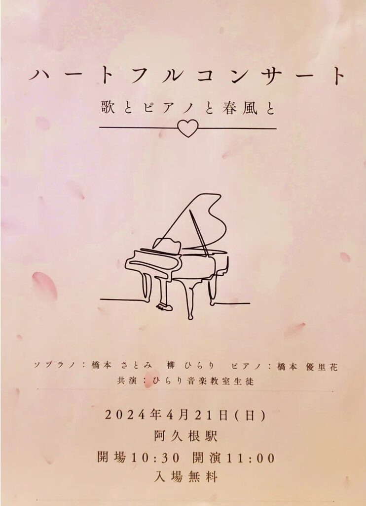 2024年4月21日(日)@11:00 – 12:00 – ハートフルコンサート@にぎわい交流館阿久根駅 ハートフルコンサート 歌とピアノと春風と ■出演者 ・ソプラノ […]