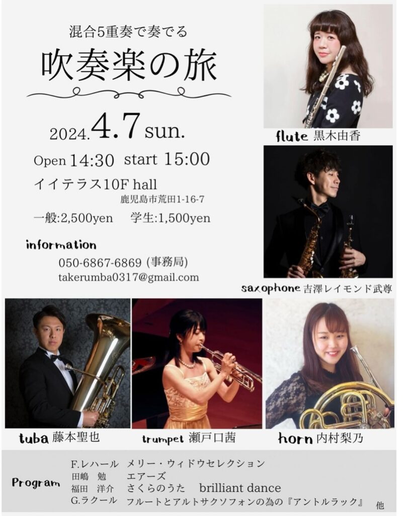 2024年4月7日(日)@15:00 – 17:00 – 混合5重奏で奏でる「吹奏楽の旅」 ■出演者 ・黒木由香(Flute) ・吉澤レイモンド武尊(Sax) ・内村梨 […]