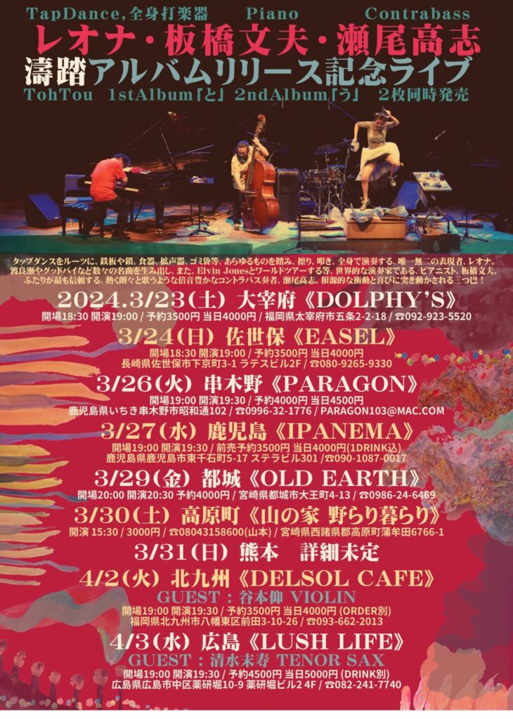 2024年3月27日(水)@19:30 – 21:30 – レオナ(Tap) 板橋文夫(Pf) 瀬尾高志(Ba)「濤踏」アルバムリリース記念ライブ@IPANEMA 濤踏( […]