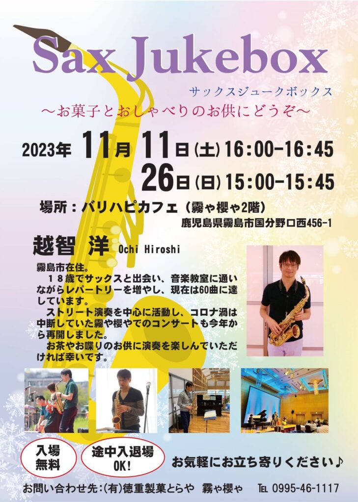 2023年11月11日(土)@16:00 – 16:45 – Sax Jukebox サックスジュークボックス お菓子とおしゃべりのお供にどうぞ ■出演者 ・越智洋(Sax […]