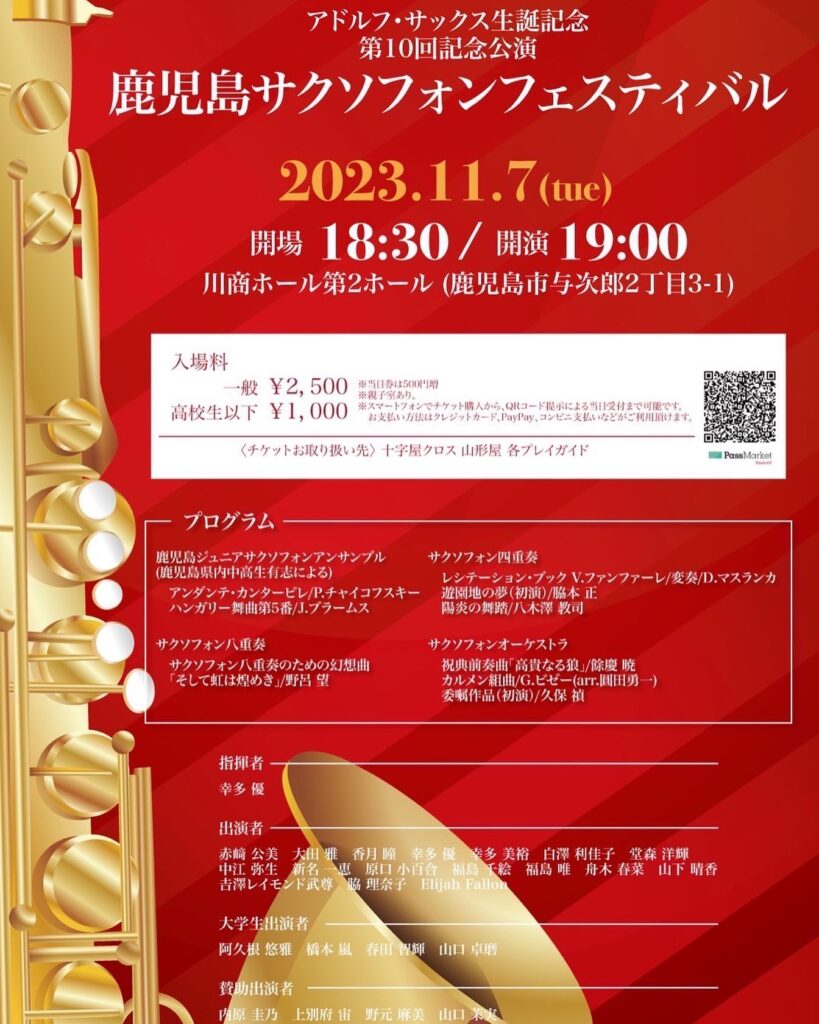 2023年11月7日(火)@19:00 – 21:00 – アドルフ・サックス生誕記念 第10回記念公演 鹿児島サクソフォンフェスティバル ■日時 2023年11月7日( […]