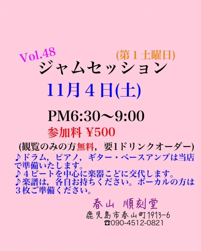 2023年11月4日(土)@18:30 – 21:00 – ピアノ、ドラム、ベースギターアンプは、当店で準備します。 4ビートを中心に楽器ごとに交代します。 楽譜は各自お […]