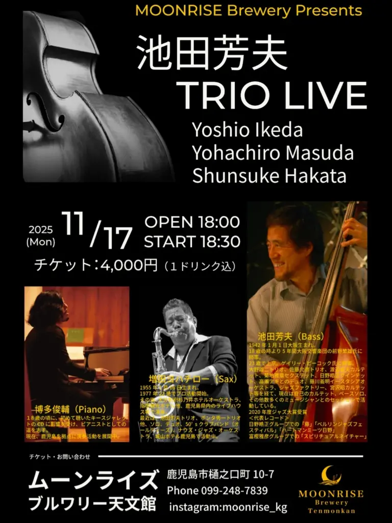 2025年11月17日(月)@18:30 – 20:30 – 池田芳夫 TRIO LIVE Sunday at the MOONRISE Brewery