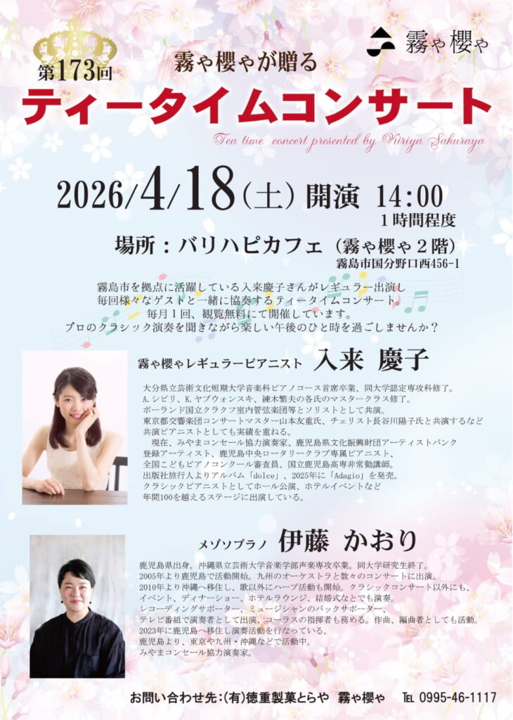 2026年4月18日(土)@14:00 – 15:00 – 霧島市を拠点に活躍している入来慶子さんがレギュラー出演し毎回様々なゲストと一緒に協奏するティータイムコンサート […]