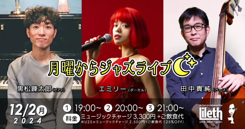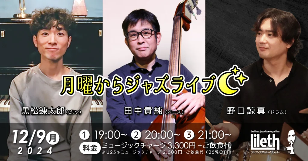 黒松錬太郎(Pf)×田中貴純(Ba)×野口諒真(Ds) ★ 月曜からジャズライブ