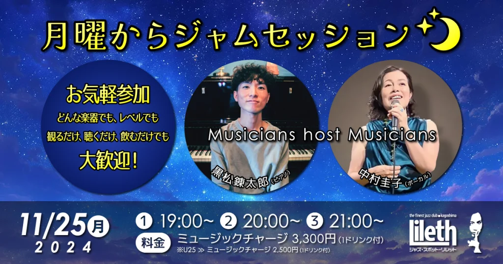 2024年11月25日(月)@19:00 – 21:30 – 黒松錬太郎氏による特別企画『月曜からジャムセッション』を開催します どんな楽器でも、どんなレベルでも、観るだけ […]