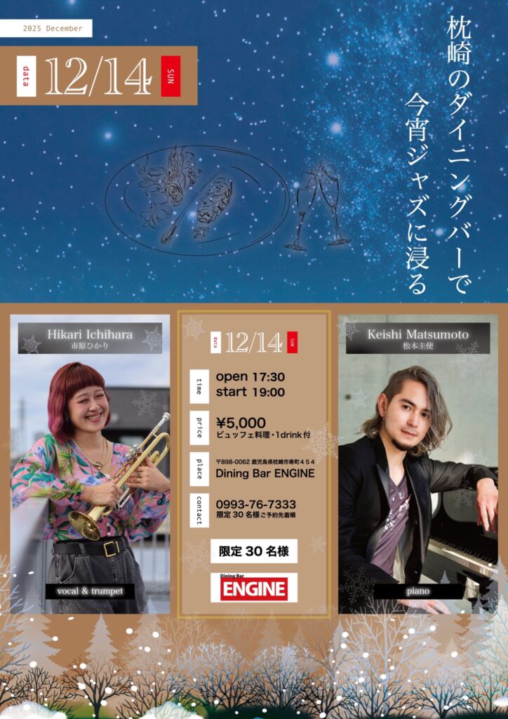2025年12月14日(日)@19:00 – 21:00 – 市原ひかり(Vo/Tp) × 松本圭使(Pf) ~枕崎のダイニングバーで冬宵ジャズに浸る~