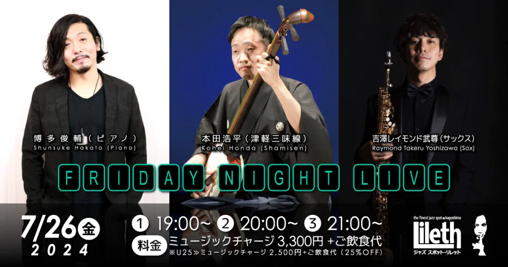 2024年7月26日(金)@19:00 – 21:30 – 博多俊輔(Pf)×本田浩平(津軽三味線)×吉澤レイモンド武尊(Sax) Friday Night Live ■ […]